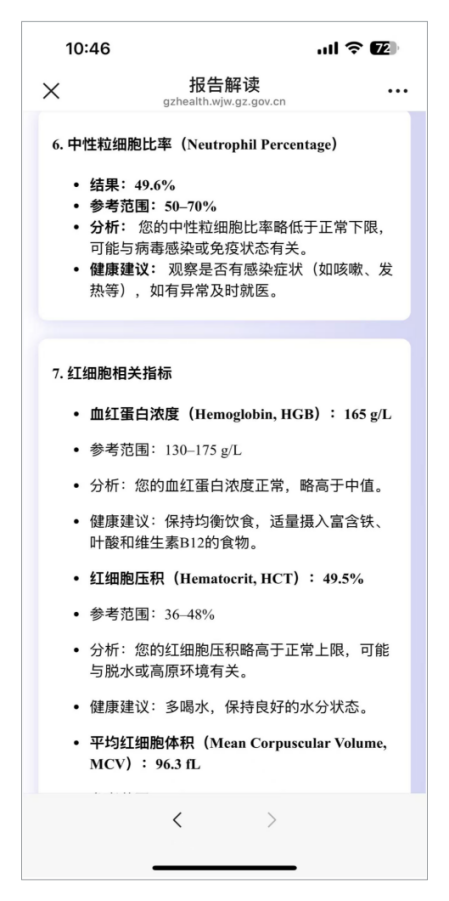 为提升居民就医体验,广州市卫生健康委积极探索人工智能创新应用场景,部署DeepSeek大模型,聚焦医疗与公卫服务升级,推出检验检查报告AI解读服务和“智慧公卫服务”栏目,让健康数据一目了然,医疗服务精准直达,开启个性化健康管理新体验。