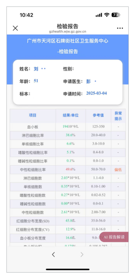 居民通过“广州健康通”微信公众号或小程序,在推送的检验检查报告界面点击“AI报告解读”,可获取检验检查报告的智能解读服务。