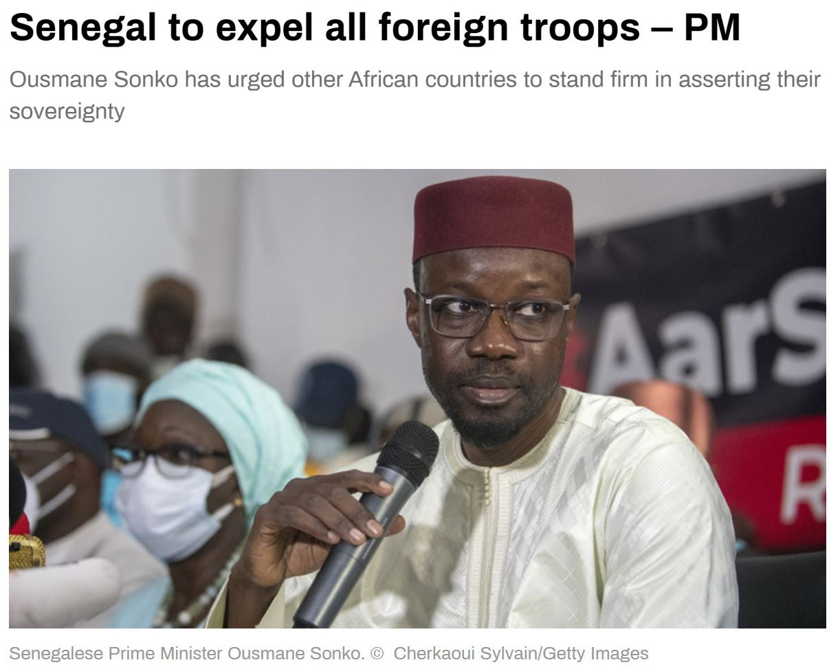 据俄罗斯媒体当地时间21日报道,塞内加尔总理奥斯曼·松科日前宣布,所有驻扎在该国的外国军事人员必须在7月底之前撤离,塞内加尔领土上不会再有外国军事基地。