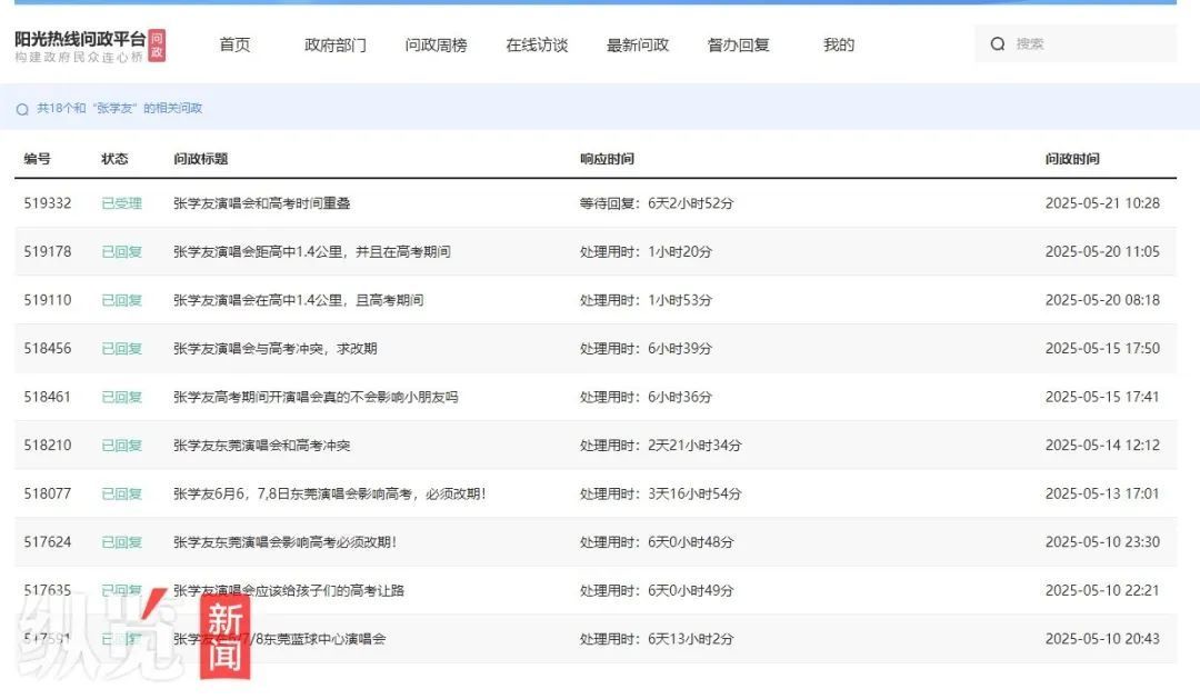 在东莞市有关部门主办的“阳光热线问政平台”,记者发现,已有十多名网友进行反映,希望张学友演唱会能够改期。一名网友在反映帖子中称,演唱会场馆和高考考点东莞市第六高级中学距离只有2公里。即使政府承诺做好了万全的措施和预案,作为高考的家长,我们仍有诸多顾虑,哪怕只有万分之一的可能对高考产生影响。
