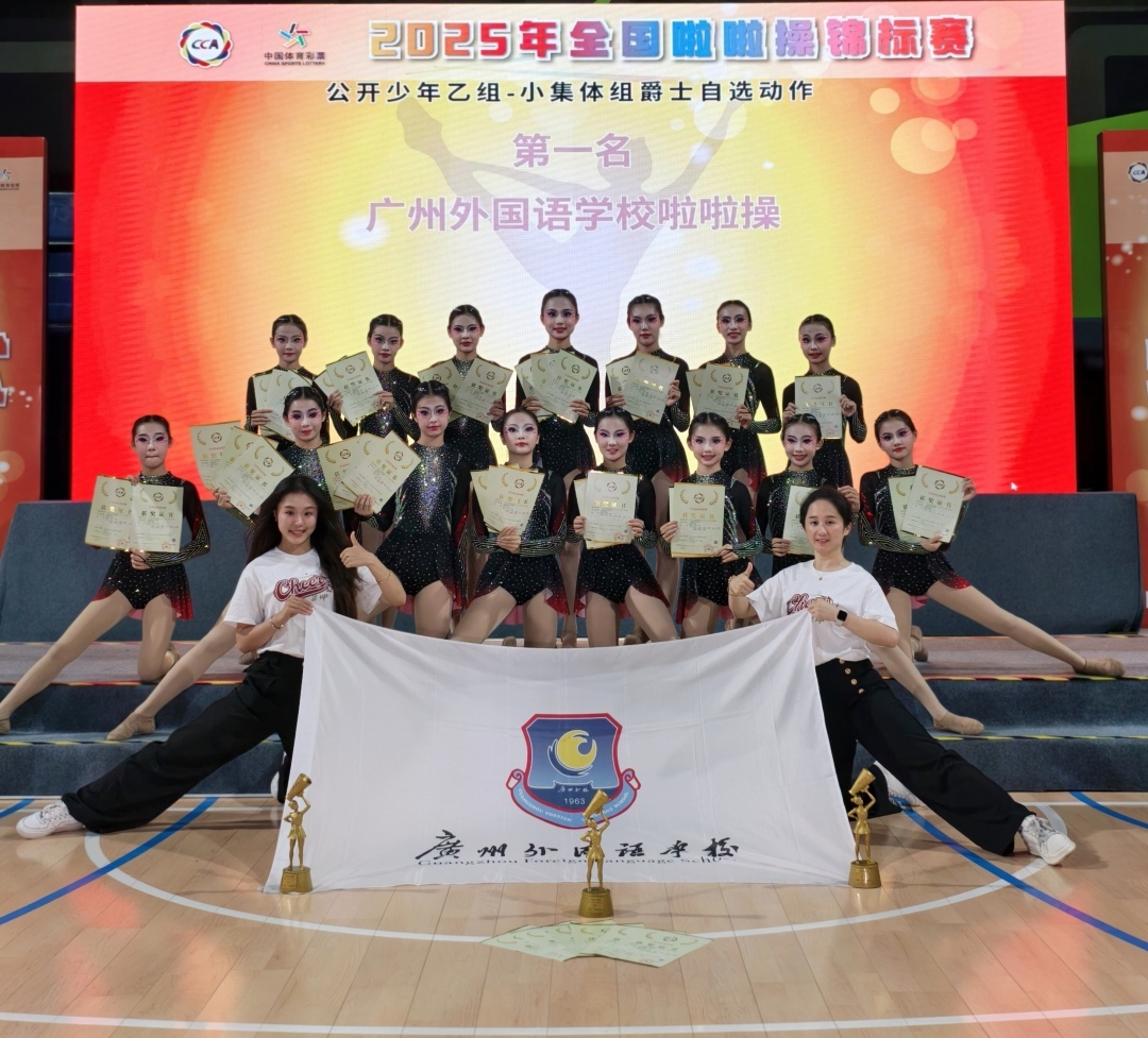 校方介绍,广州外国语学校是广东省体育传统特色学校,学校健美操项目是广州市第二批中小学校高水平学生体育美育团队。近年来,学校大力推进啦啦操项目,获评全国啦啦操优秀推广单位、全国大课间啦啦操优秀创编校,获全国啦啦操优秀组织奖、广东省啦啦操赛事优秀组织奖、广州市啦啦操优秀学生社团。队员邹菁淇代表广东省参加第一届全国学生(青年)运动会荣获技巧啦啦操全国冠军,学校啦啦操队多次参加省、市级比赛夺冠。
