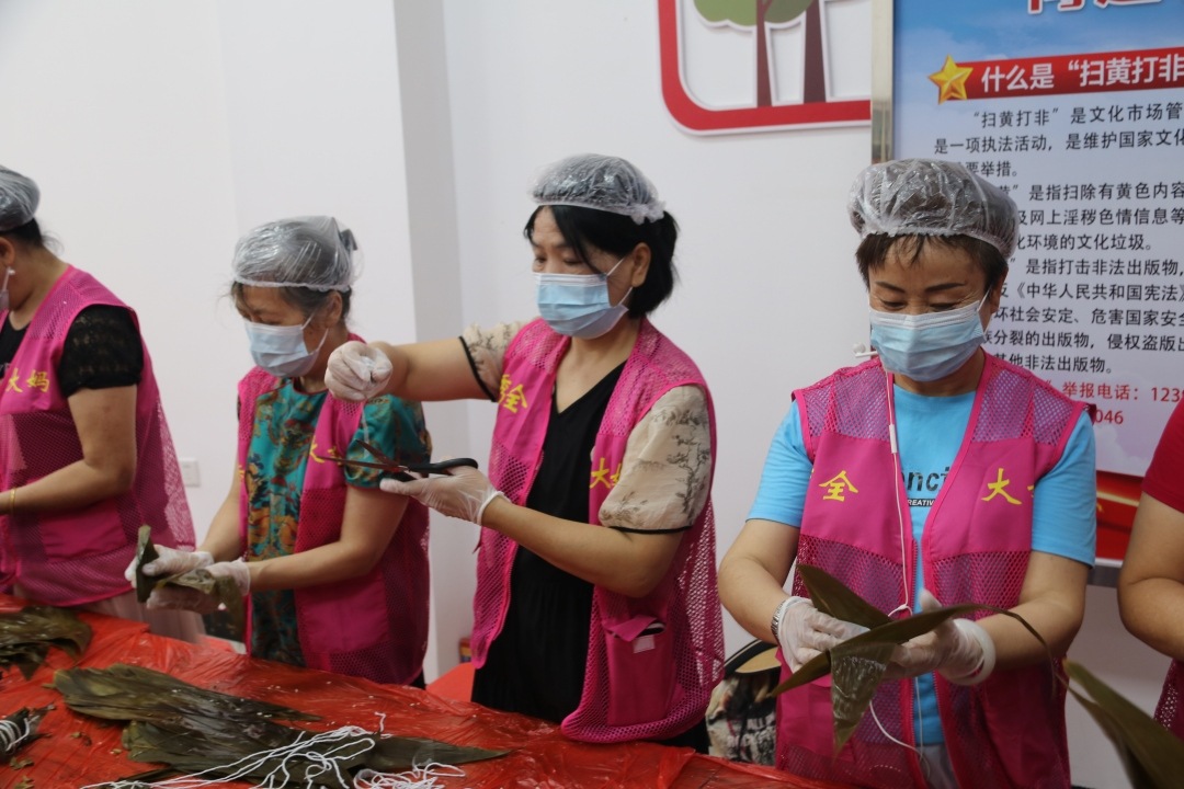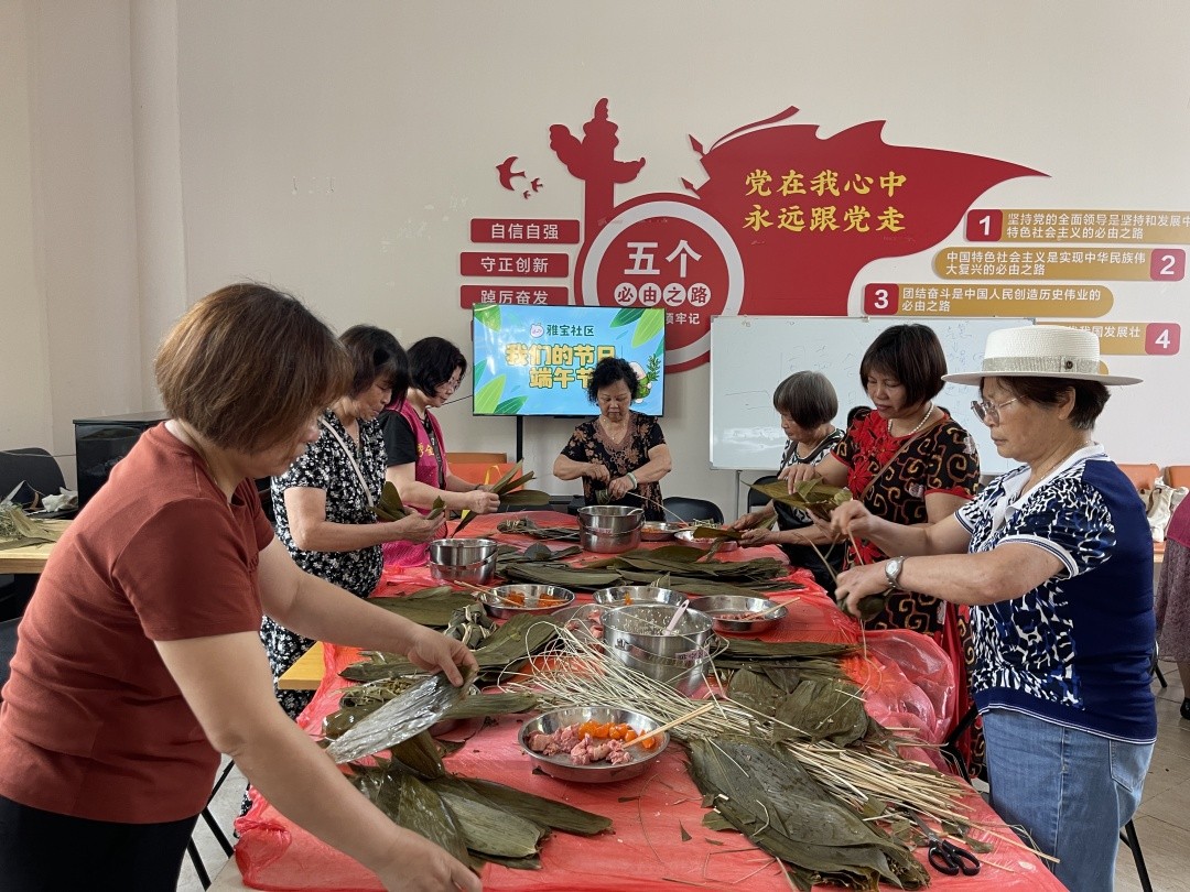 与此同时,雅宝社区颐康站内也暖意融融。60余名秀全大妈和“五老”群体欢聚一堂,共同参与以“粽情茶话”为主题的“我们的节日·端午”新时代文明实践活动。该活动以包粽子、品茶、互动交流的方式传承文化,共叙邻里情。活动期间,大家巧手翻飞,包出四百余个粽子,情意满满。该社区颐康站内粽叶清香与欢声笑语交织,大家围坐品尝水果,畅谈社区建议,雅宝社区居委会主任负责人认真聆听并回应。