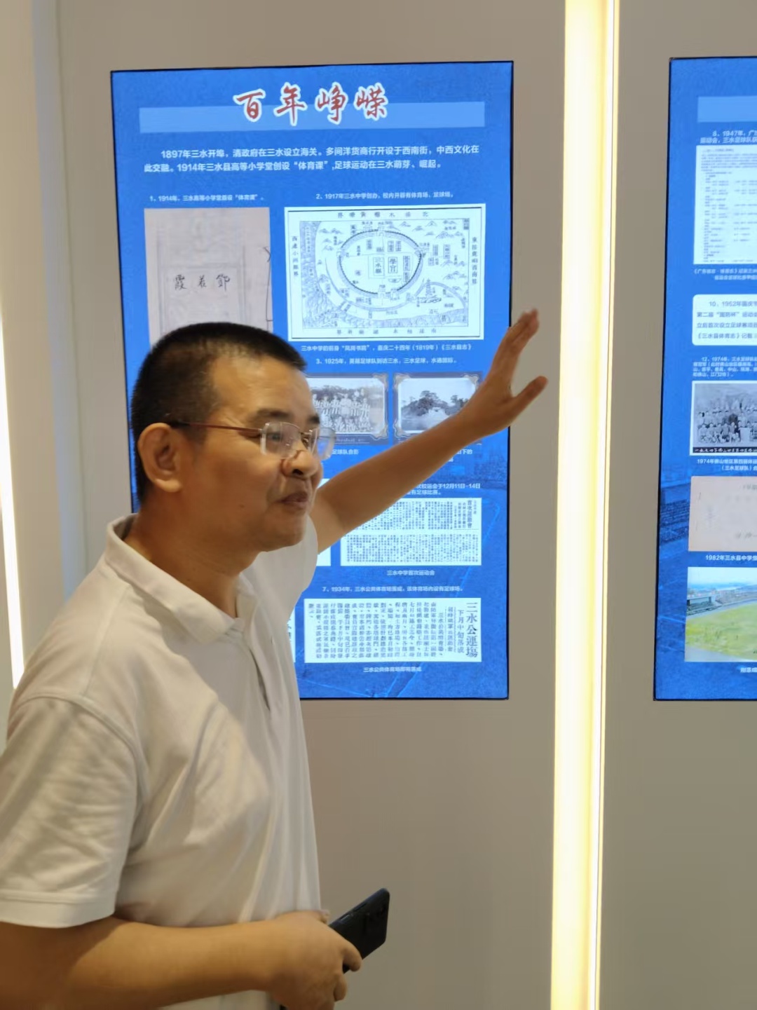 三水文史专家麦国培在三水百年足球展馆介绍三水的足球历史底蕴。