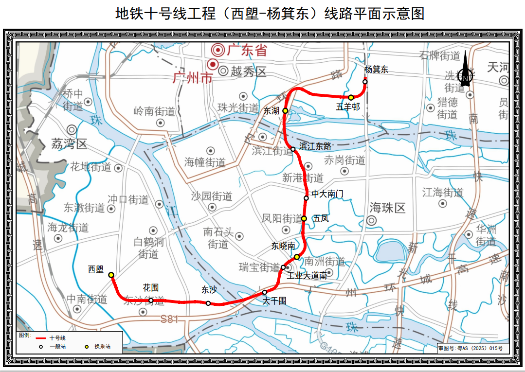 广州地铁十号线是“斜跨”广州中心城区的骨干线路,与十二号线共同构成广州城市轨道交通线网骨架中的“X”对角线。十号线(西塱至杨箕东)将在年内开通运营,全长17.2公里,设置12座车站(其中,中大南门站暂缓开通),换乘站有5座,分别是西塱(一号线、广佛线)、东晓南(二号线)、五羊邨(五号线)、东湖(六号线)、五凤(十一号线)。