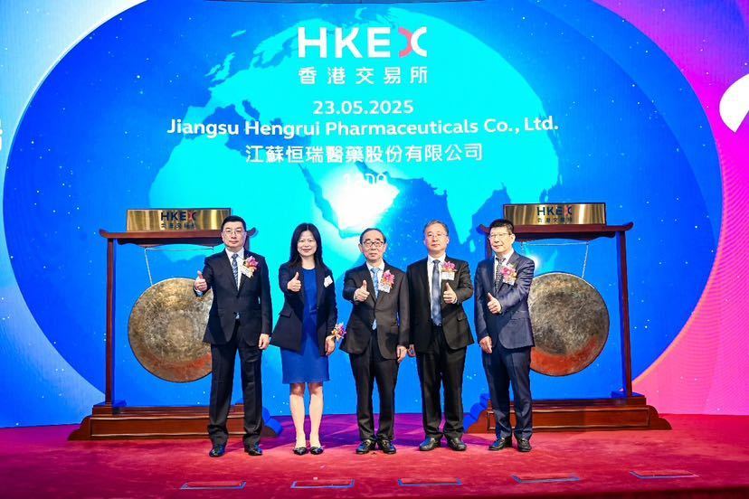 5月23日,恒瑞医药在香港联合交易所主板正式挂牌上市(股票代码为1276.HK),迈入“A+H”双平台时代。恒瑞医药此次全球发售H股总数为224,519,800股(行使超额配售权之前),发行价44.05港元,为发行区间上限定价。本次公司IPO成为近五年港股医药板块最大IPO,也是目前2025年度第二大港股IPO。本次港股上市从交表到上市仅用了4个多月,获得了国际资本市场的热烈响应,基石投资者涵盖新加坡政府投资公司(GIC)、景顺(Invesco)、瑞银全球资产管理集团(UBS-GAM)、高瓴资本、博裕资本等知名机构,参与国际配售的锚定投资者群体亦汇聚国际知名长线基金、主权财富基金等大型投资机构。港股上市开盘即高开,开盘价57港元/股,较发行价上涨29.4%。