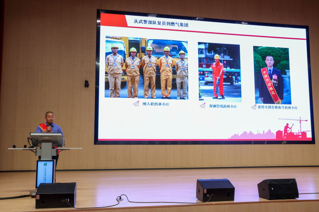 劳模们的宣讲不仅是故事的分享,更是价值观的传递。林小江——广州燃气集团的“全国劳动模范”,用17年如一日的坚守诠释了“执着”二字。他带领团队用双脚丈量出广州首份燃气管线地图,创新抢险方法,实现燃气抢修零事故的奇迹。