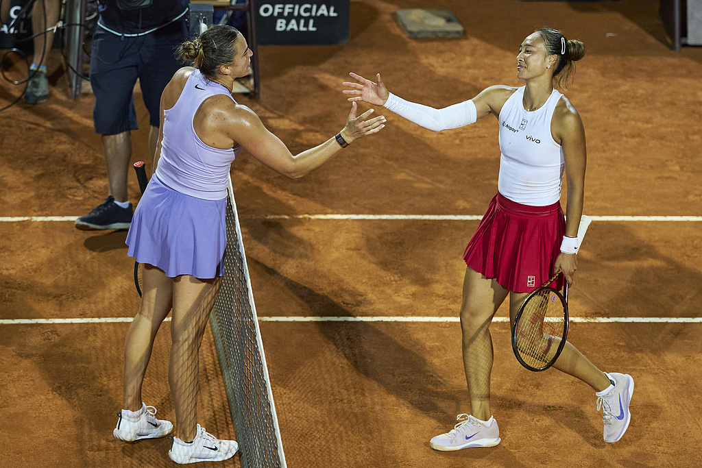 △当地时间2025年5月14日,郑钦文在2025WTA1000罗马公开赛女单比赛中战胜萨巴伦卡。