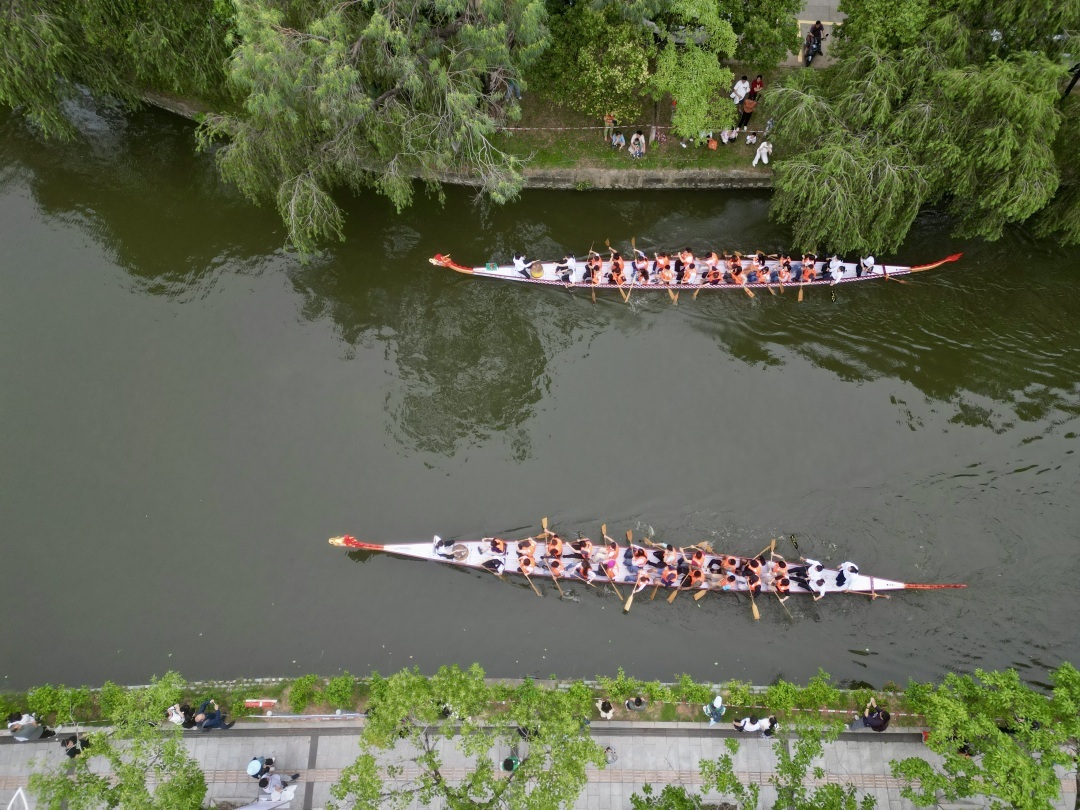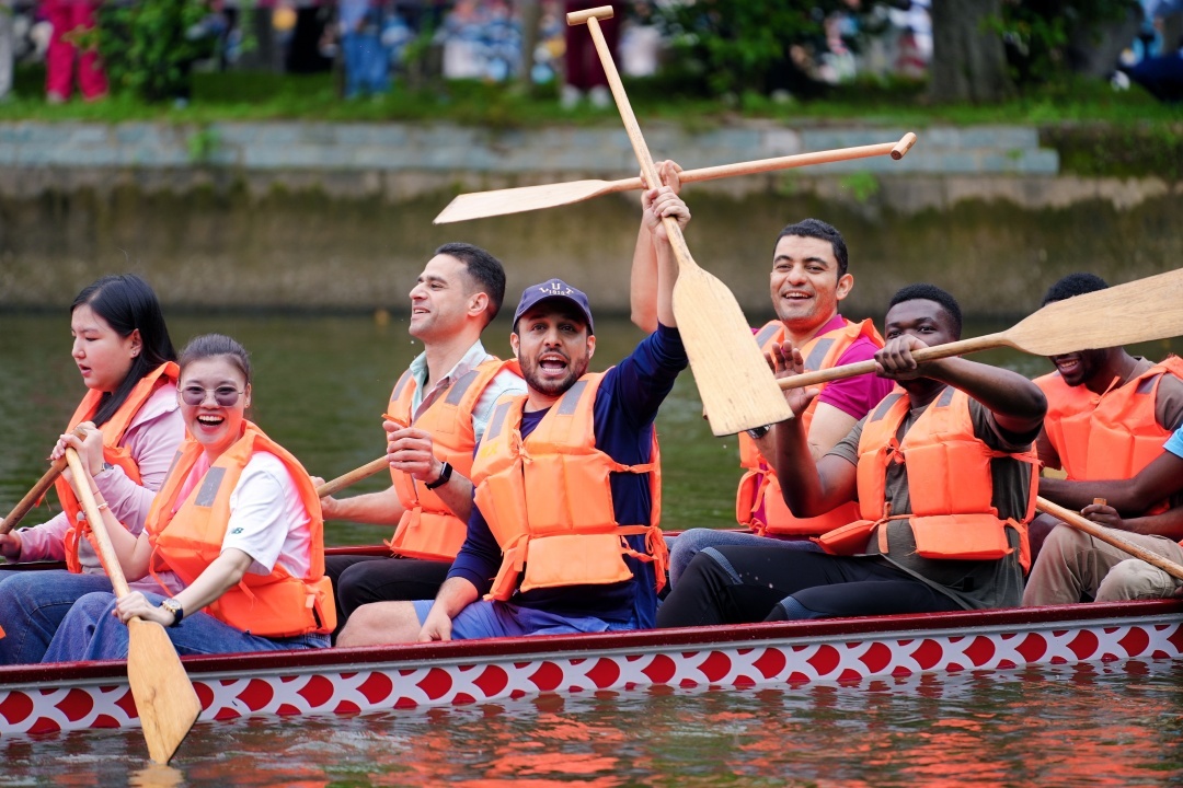 随着鼓声响起,当日龙舟进高校研学活动迎来高潮——龙舟体验营。高校学子及留学生们在冠军教练的带领下,在华南农业大学宁荫湖进行了一场精彩的水上竞速教学赛。对留学生们来说,尽管初次尝试,但大家热情满满,沉浸式体验扒龙舟的快乐,也感受着龙舟文化别样的魅力。
