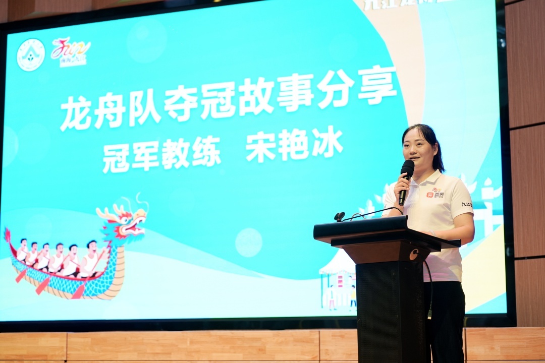 “龙舟没有个人英雄,全员节奏一致才能破浪。这就像人生,独行快,众行远,人生总得拿一回桨,希望同学们在未来道路上齐心协力,人人皆可成‘九江龙’!”宋艳冰通过龙舟运动向同学们传递自己的人生感悟,鼓励他们在人生道路上奋勇拼搏。