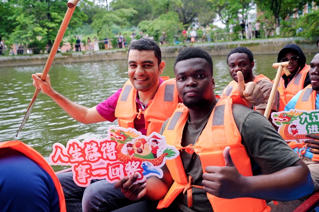 活动现场,10余名留学生格外引人注意。来自津巴布韦的特迪告诉记者,自己了解过一些端午节的习俗,但还是第一次体验划龙舟,这次通过教学已经成功掌握了划龙舟的技巧,“很好玩,感觉非常非常开心!” 来自也门的留学生王子则表示:“这次活动不仅让我们从学习压力之中得到放松,更让我们看到了中华传统文化的博大精深,有机会还会继续参与!”