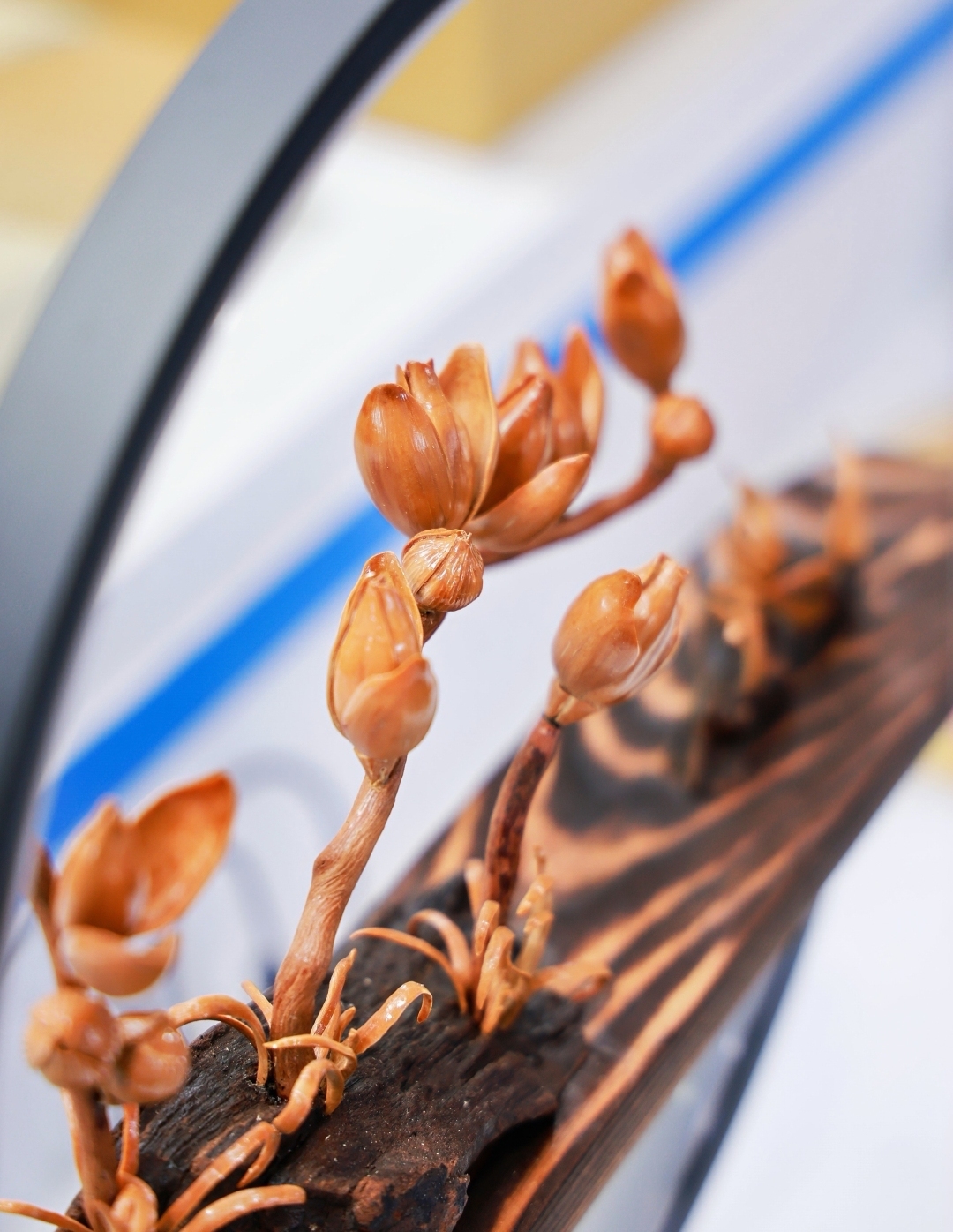 明朝文学家魏学洢创作的《核舟记》,相信很多人都在学生时代学习过。文中的“核舟”正是核雕(榄雕)的一种,这一非遗技艺已发展一千多年,在本届文博会的广州馆上,它又引来了关注的目光。橄榄壳或是其他坚果壳,可以在妙手雕刻后变成手串、摆件、挂饰、好运福牌……把壳“玩”出花样的曾昭鸿,是国家级非遗代表性传承人。今年,他带来的作品叫《兰语清风》,巧妙运用传统圆雕、镂空雕技法与独特镶嵌工艺,精细雕琢玉兰花含苞待放、盛放及悠然自得的优雅形态,小草仿佛在微风中律动,栩栩如生,尽显自然之韵。