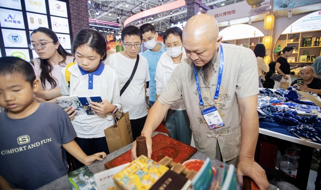 “这是蜡染,与大家平时见到的扎染制作工艺完全不同。”在国家级非遗代表性项目珙县苗族蜡染展位,国家级非遗代表性传承人熊宗会以刀为笔、以蜡为媒、以靛为墨、以布为纸,给逛展观众演示苗族蜡染制作流程。熊宗会介绍,珙县苗族蜡染色泽以蓝白为主,过去主要用于制作苗家姑娘的百褶裙,如今已创新应用到发卡、随身镜、胸针等生活用品中,呈现着传统技艺的时尚蜕变。