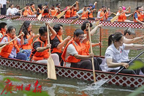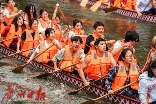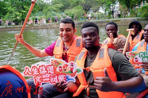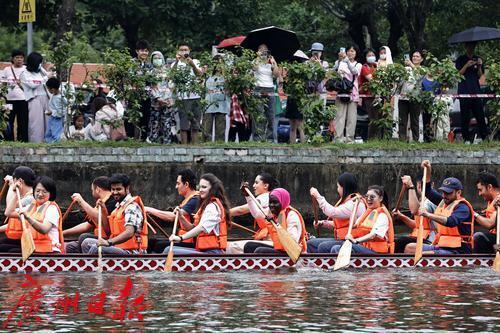 10余名留学生格外引人注意,他们许多人是第一次体验划龙舟。