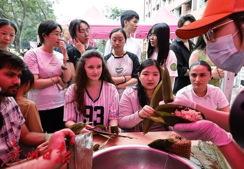 食堂师傅现场教学包粽子,中外学生围坐一桌,忙得不亦乐乎。