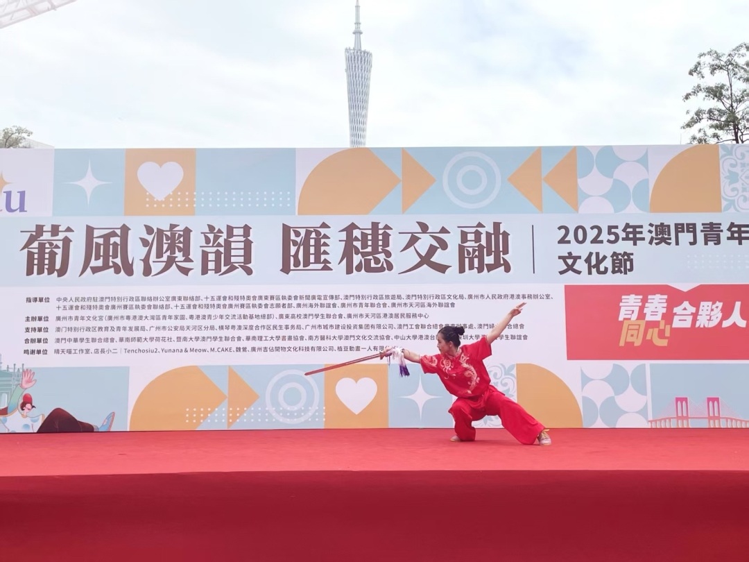 剑如游龙、拳如灵蛇,澳门同学植慧珊携手带来的武术表演一亮相,便吸引了全场目光;植慧珊同学在刚刚结束的广东省第十二届大学生运动会上,代表暨南大学一举拿下乙组女子自选长拳和自选剑术双料冠军,她以澳门青春力量传承着中华武术精神,也让现场观众深刻感受到了中华武术文化薪火相传的强大生命力……在活动现场,澳门青年凭借精彩的演出,赢得阵阵喝彩和掌声。