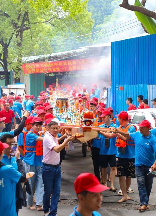 炮响锣鸣、龙舟破浪、欢呼声四起,将节日氛围推至高潮。甘宁坊更依传统,向造船厂回赠锦旗、活鹅、烧酒等礼品,传递敬意与友好。而稍后进行的南岗中街飞龙骏水仪式也热闹非凡,村民们走着“红地毯”,合力抬船入水,寄托节日美好愿望。