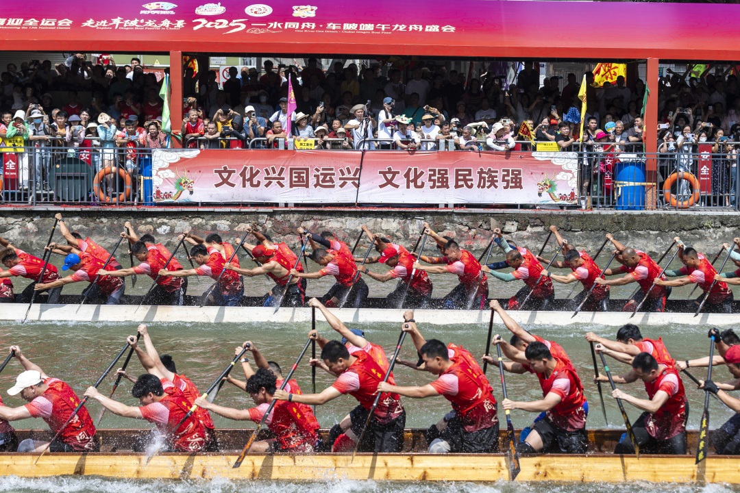 “咚咚,咚咚……”上午9点比赛拉开帷幕,锣鼓声震天响,欢呼声此起彼伏。“郝太原”“麦始兴”“高地苏”等龙舟队先后下水,健儿们身姿矫健,手臂肌肉紧绷。随着开赛号令的响起,他们踏着鼓点的节奏,奋力挥动船桨,龙舟如离弦之箭,飞速从水面划过,激起层层浪花。观众瞬间沸腾,欢呼声、加油声交织成一片,声浪一浪高过一浪。