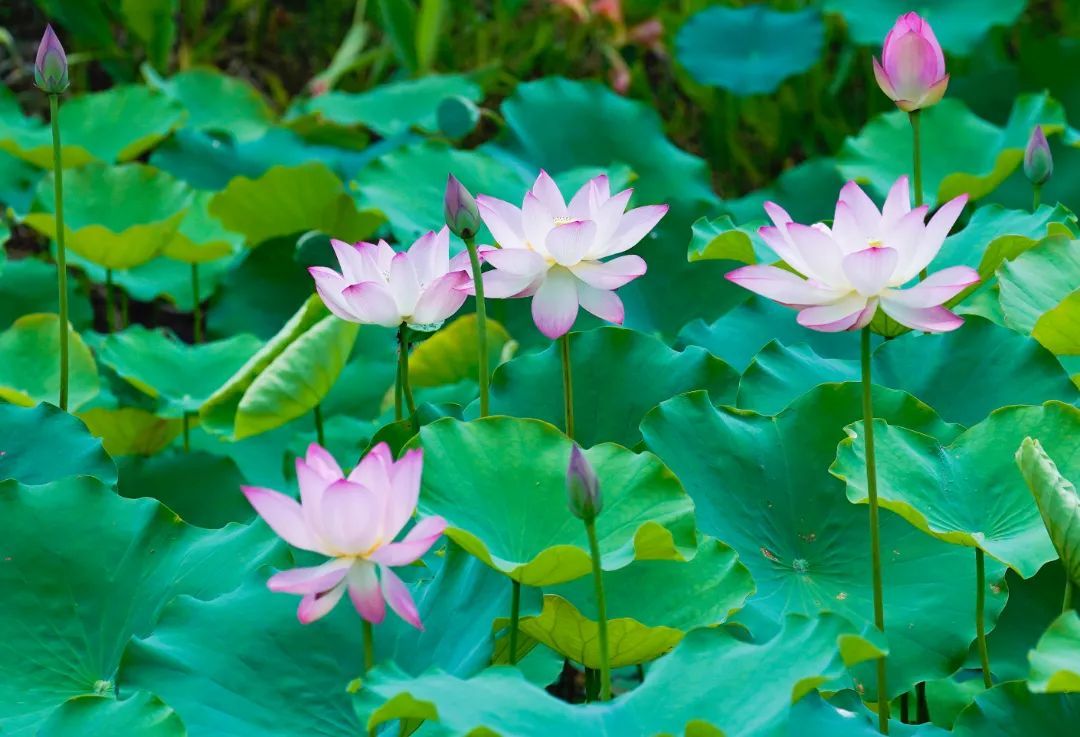荷花池里,粉色的花苞探出水面,朵朵荷花悄然绽放,或完全盛开,或半开半合,粉白色的花瓣簇拥着浅黄色的花蕊,在翠绿荷叶的映衬下,更显娇艳无比。