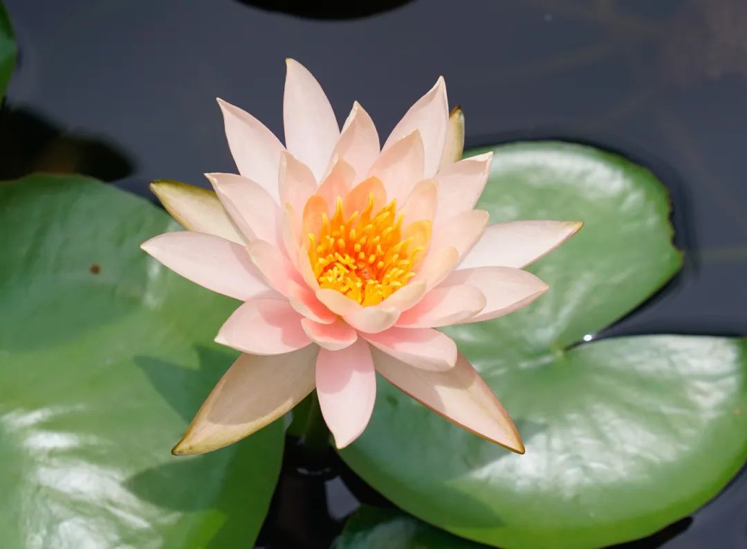 荷花池内还缀着星星点点的橘粉色睡莲,花瓣纤细,花色鲜艳明亮,圆润墨绿的莲叶随着水波荡漾。在明媚的阳光下,池水清澈见底,莲叶间不时有几尾鱼儿嬉戏。