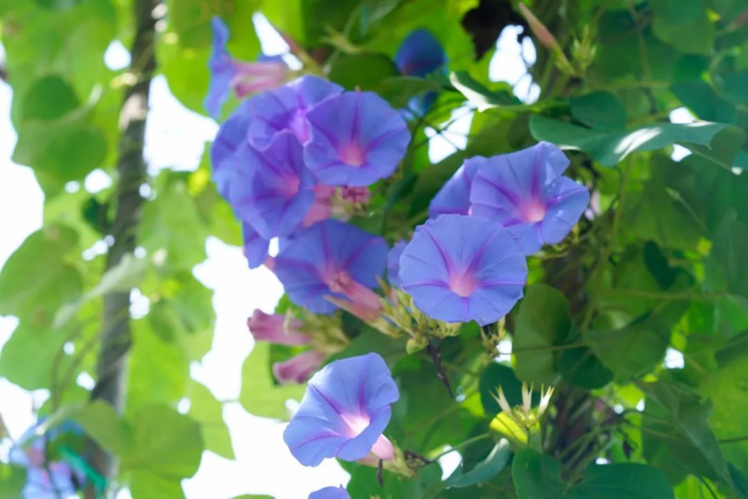 荷花池旁的瓜果长廊也不要错过,橙色的凌霄花、蓝紫色的牵牛花、有“黄金瀑布”美称的沃尔夫藤亦是绝美!
