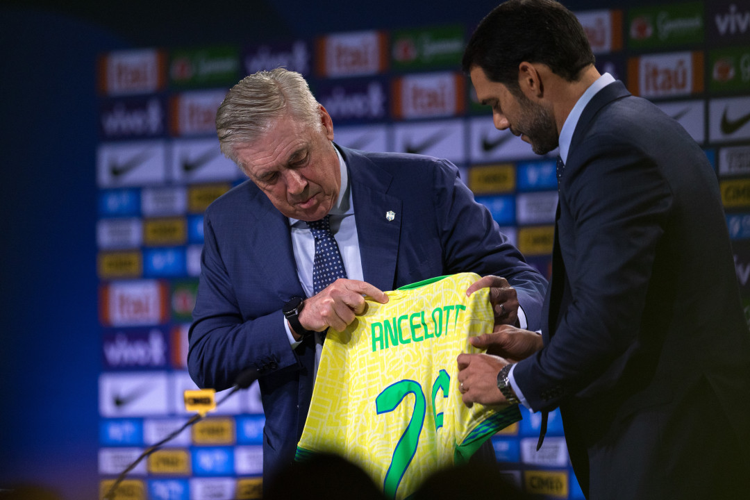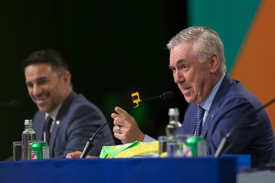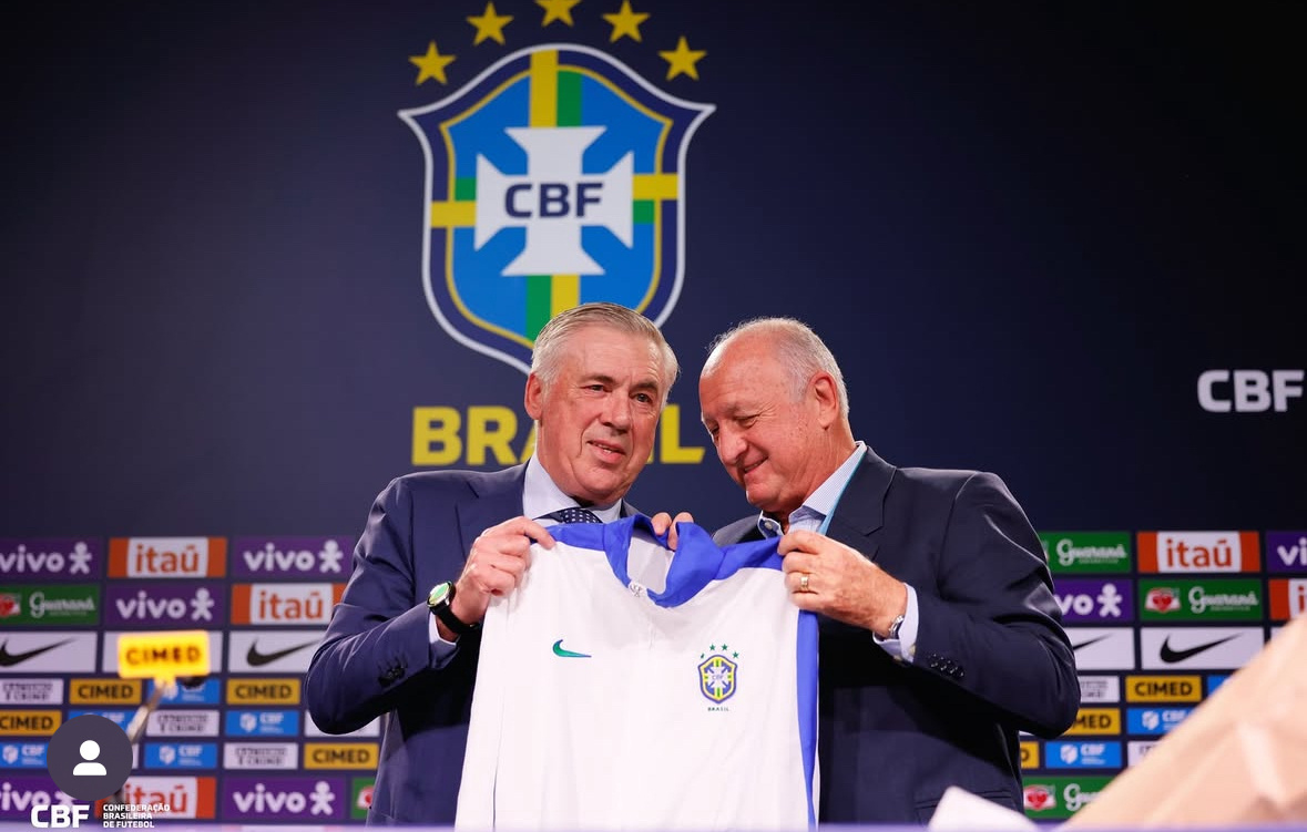 巴西足协、里约市政府官员出席了安切洛蒂的就任发布会。发布会上带领巴西夺得2002年韩日世界杯冠军的巴西老帅斯科拉里上台对安切洛蒂的就任表示支持,将巴西队传奇蓝白战袍赠予安切洛蒂,象征巴西主帅的“交棒”。