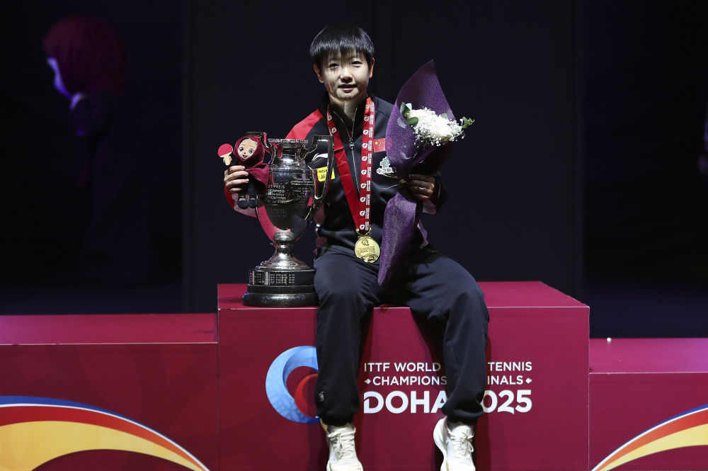 5月25日,冠军中国选手孙颖莎在颁奖仪式上。当日,在卡塔尔多哈举行的2025世界乒乓球锦标赛女子单打决赛中,中国选手孙颖莎4比3战胜中国选手王曼昱,夺得冠军。新华社记者 王东震 摄