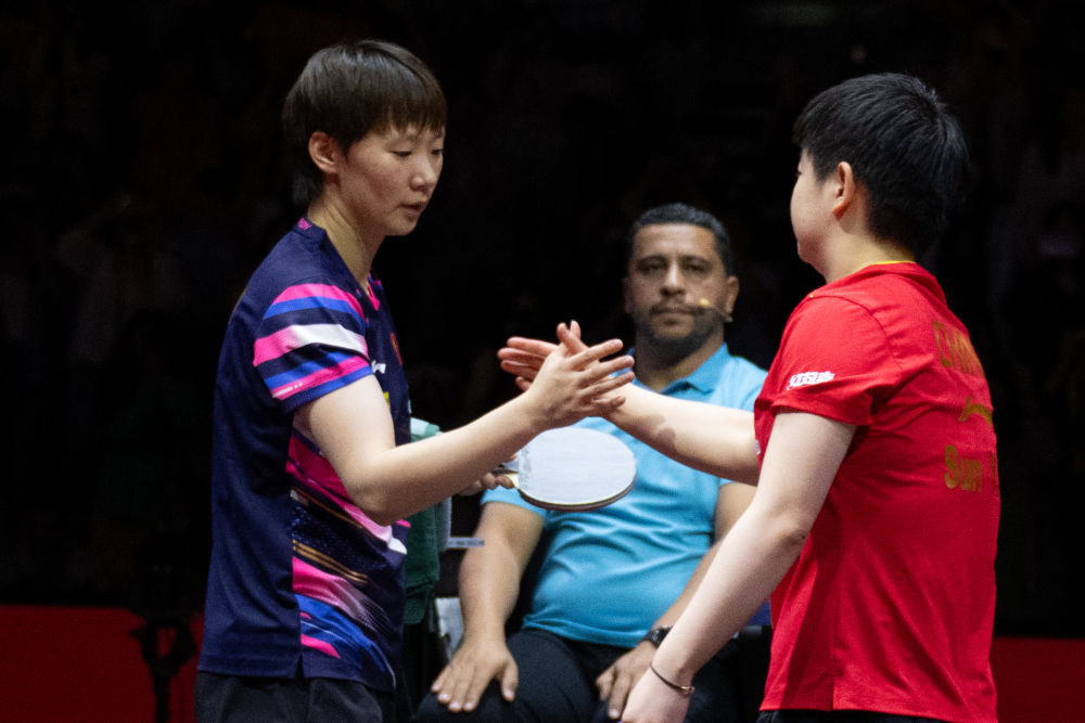 5月25日,王曼昱(左)与孙颖莎(右)赛后互相致意。新华社记者 肖艺九 摄