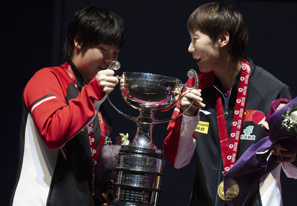 5月25日,冠军中国组合王曼昱/蒯曼(左)在颁奖仪式上。当日,在卡塔尔多哈举行的2025世界乒乓球锦标赛女子双打决赛中,中国组合王曼昱/蒯曼3比0战胜波尔卡诺娃(奥地利)/斯佐科斯(罗马尼亚)组合,夺得冠军。新华社记者 肖艺九 摄