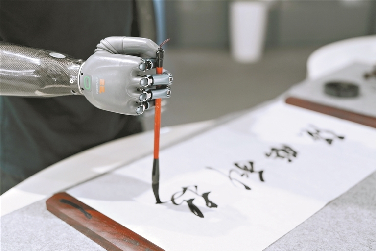 强脑科技的智能仿生手体验官用“科技手”展示写书法。