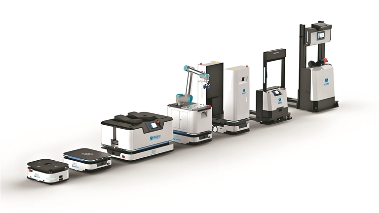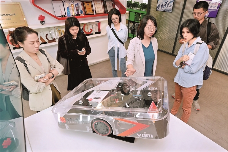 蓝芯科技工作人员向本报调研团队展示一款为客户提供智慧物流解决方案的移动机器人。