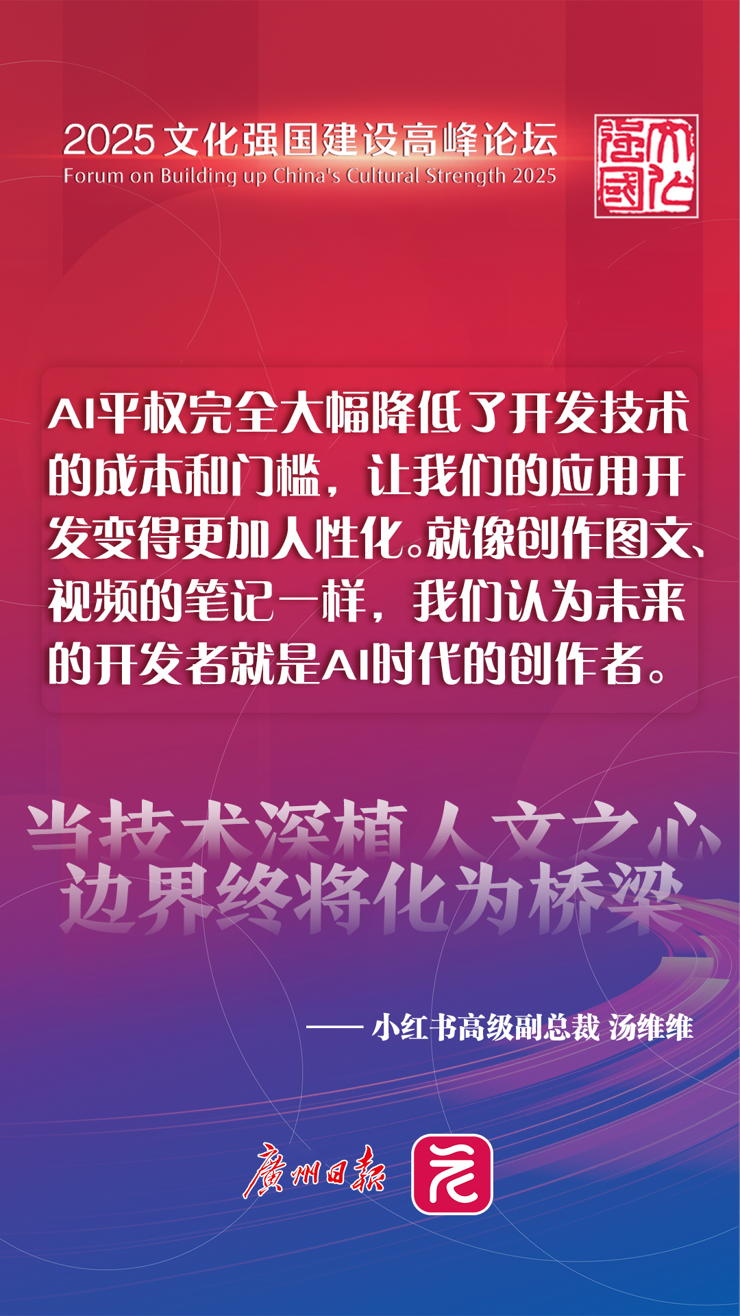 在2025年5月27日举行的2025文化强国建设高峰论坛的文化和科技融合发展论坛上,小红书高级副总裁汤维维发表了精彩的演讲。她认为,当技术深植人文之心,边界终将化为桥梁。