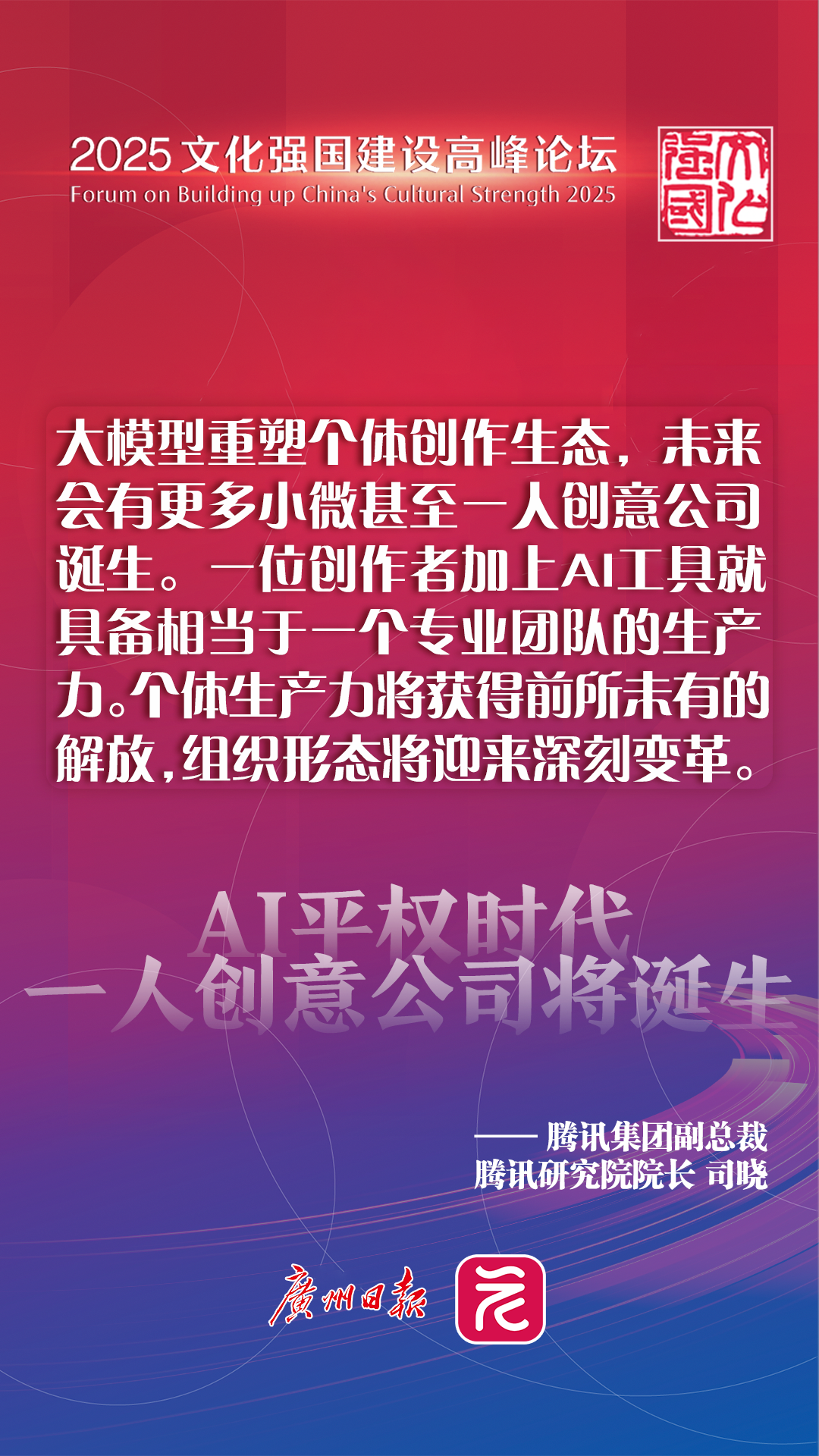 在5月27日举行的2025文化强国建设高峰论坛上,腾讯集团副总裁、腾讯研究院院长司晓发表了精彩的演讲。他认为,AI平权时代,一人创意公司将诞生。
