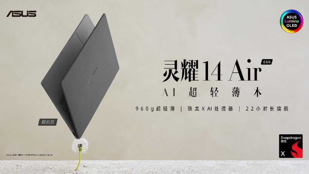 华硕灵耀14 Air骁龙版以不到1kg的超轻量化设计,重新定义生产力,方便通勤人士随时随地轻松出行。 搭载全新高效的骁龙X AI处理器,可充分发挥强大AI算力,大容量长寿电池能确保工作连续不间断,支持实现移动办公和高效生活。全新极简风格搭配源自大自然的色彩,强调高端、优雅气质。整机采用高科技陶瓷铝材质,兼具轻巧耐用和超凡强度,在抗磨损,抗指纹、硬度等方面表现优异。超轻量化机身便于日常携带,而超长续航与强劲性能则让用户的创作空间不受限,成就更多可能。