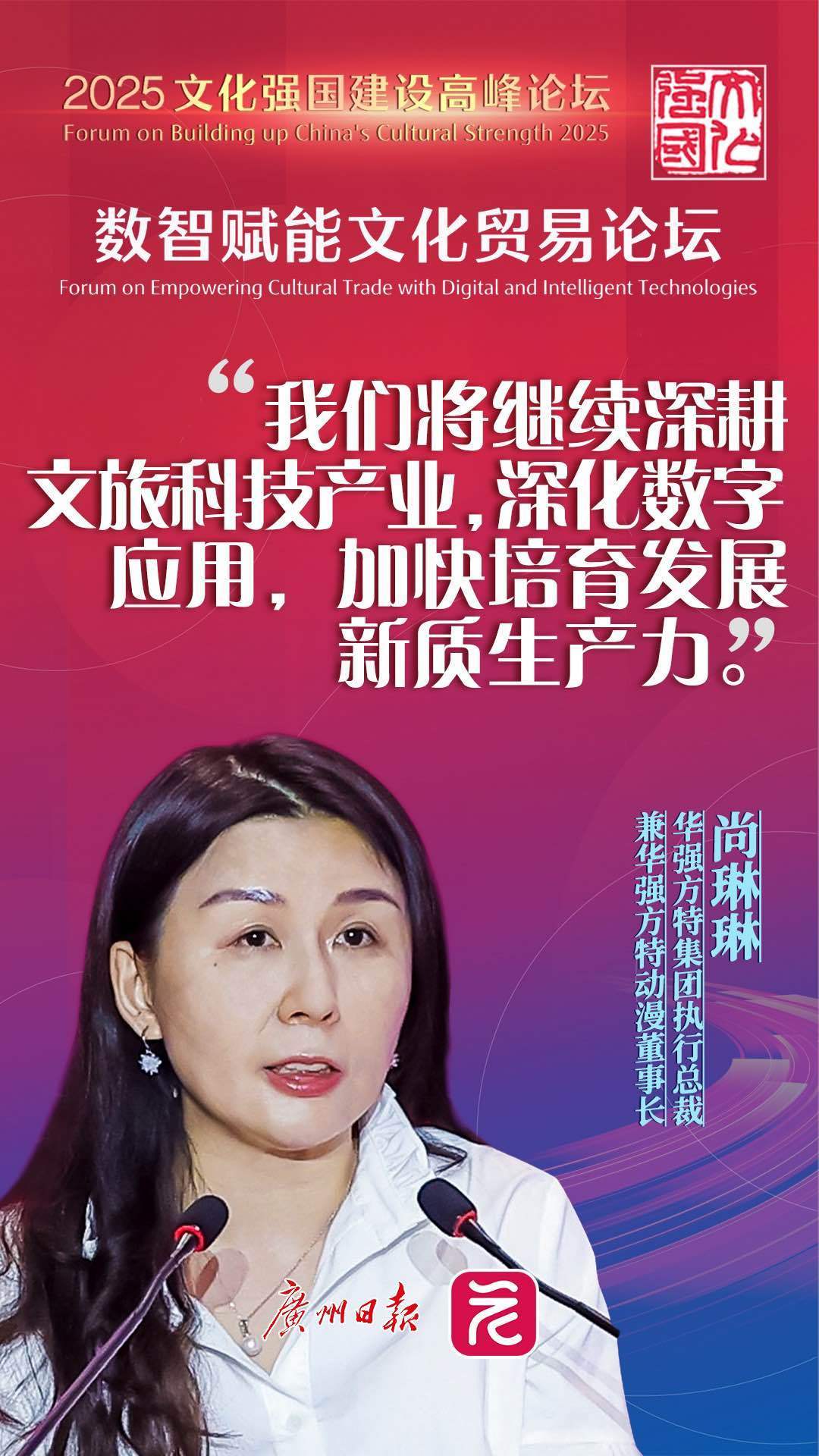 在5月27日举行的2025文化强国建设高峰论坛“数智赋能文化贸易”分论坛上,华强方特集团执行总裁兼华强方特动漫董事长尚琳琳表示,文化出海要运用国际化表达方式,贴近海内外受众,创作基于人类共通情感的故事。