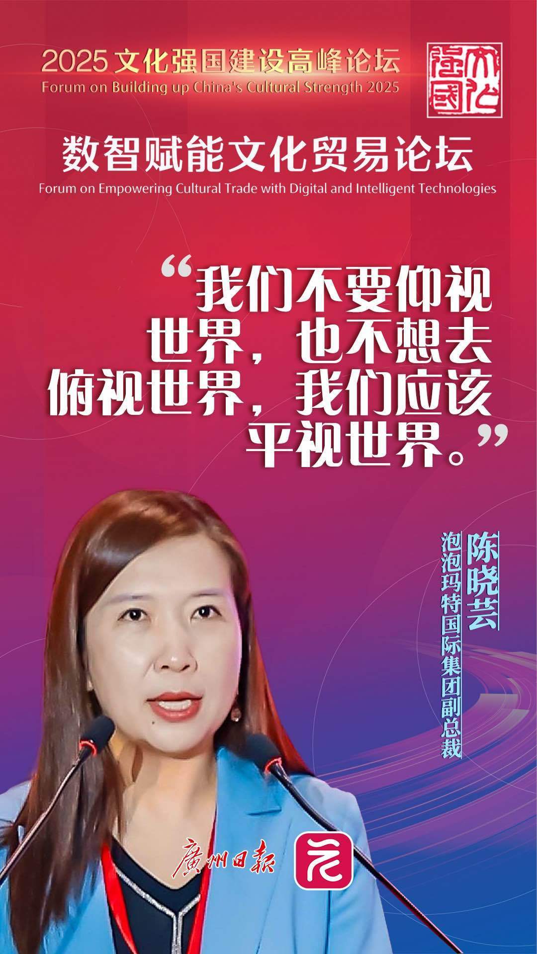 在5月27日举行的2025文化强国建设高峰论坛“数智赋能文化贸易”分论坛上,泡泡玛特国际集团副总裁陈晓芸发表了精彩的演讲,她说:“泡泡玛特的全球化进程,体现了中国企业在出海时应秉持的一个态度:我们不要仰视世界,我们也不想去俯视世界,我们应该平视世界,在同一个世界中的我们是一样的。”