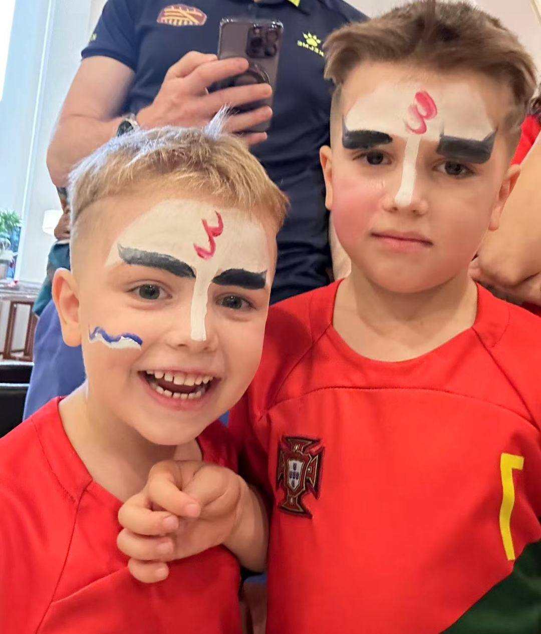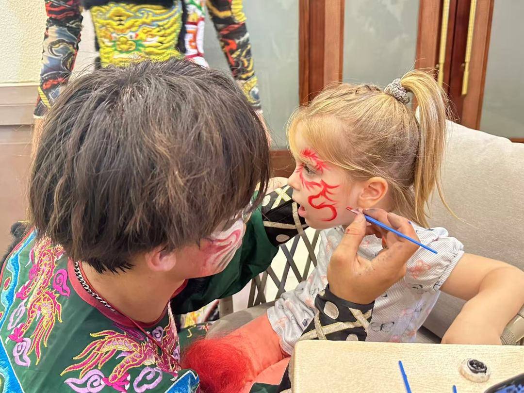 金湖花园的居民中,有不少国际友人,他们对英歌舞表演也充满好奇。有的小朋友在体验英歌舞脸部化妆后,看到自己的新形象后,脸上露出了笑容。