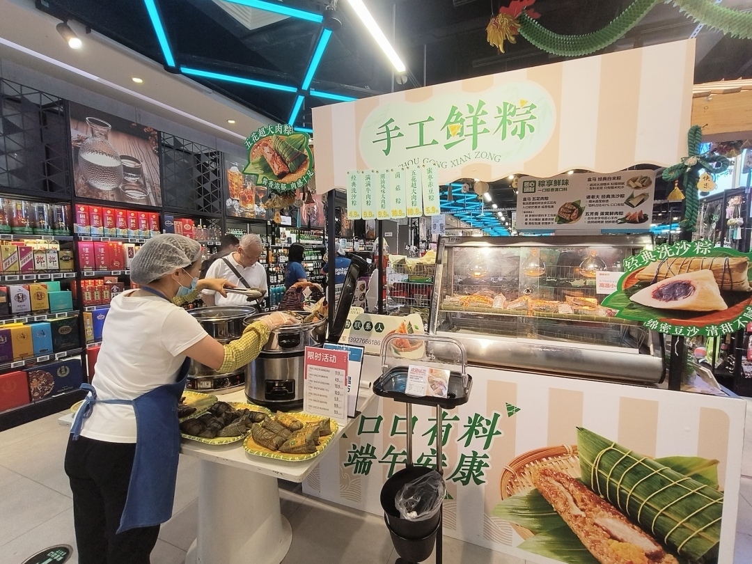 在广东,消费者口味上偏爱传统口味的咸蛋黄肉粽,今年盒马引入东莞非遗道滘粽,也是道滘粽首次进入零售商超渠道,形状和口味上的差异,受到不少消费者青睐。