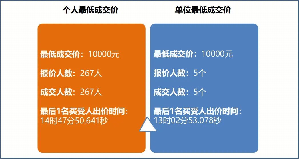 从个人竞价结果来看,最低成交价为10000元,平均成交价10487元,最低成交价的报价人数267人,最低成交价的成交人数267人,最后一名买受人出价时间14时47分50.641秒。