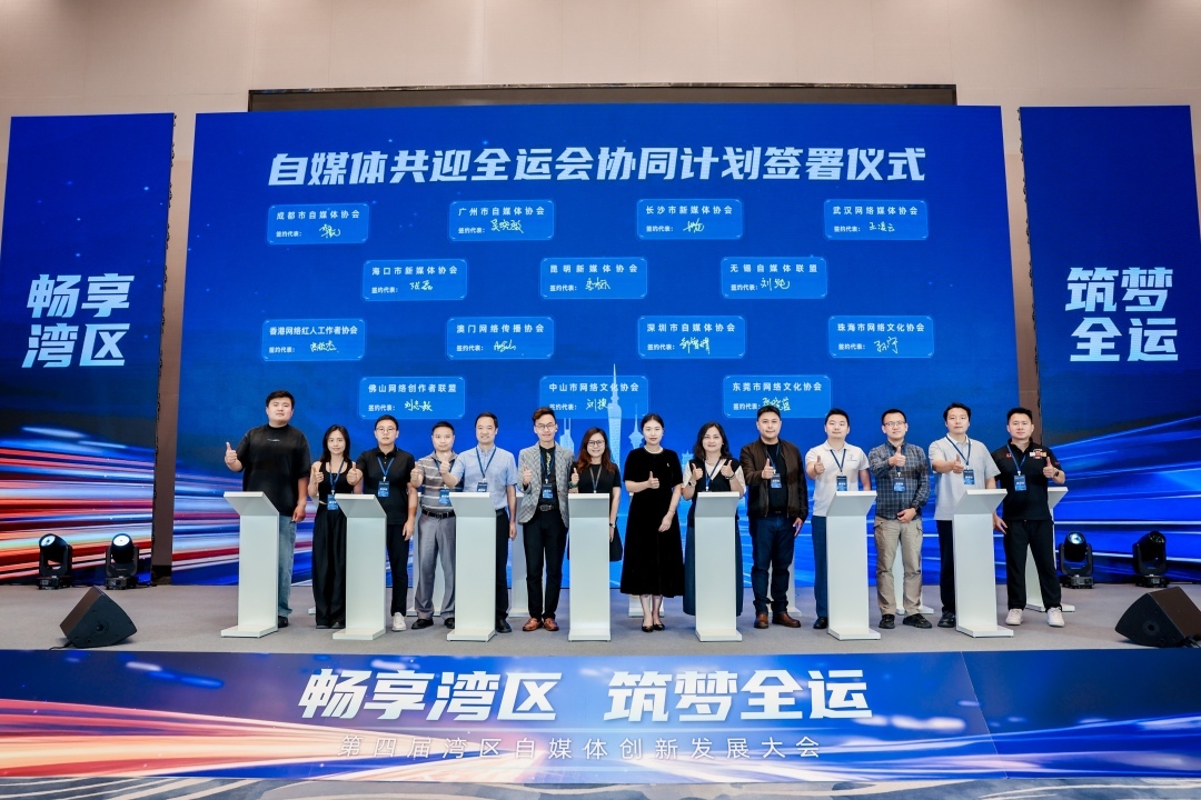 在探讨城市经济发展新动能的同时,大会着眼即将到来的十五运会,着力构建跨区域自媒体传播矩阵。为助力这一体育盛会,现场,来自广州市自媒体协会、深圳市自媒体协会、珠海市网络文化协会、佛山网络创作者联盟、东莞市网络文化协会、中山市网络文化协会、香港网络红人工作者协会、澳门网络传播协会等粤港澳大湾区城市,以及成都市自媒体协会、长沙市新媒体协会、武汉市网络媒体协会、昆明新媒体协会、海口市新媒体协会、无锡自媒体联盟等外省兄弟城市共14个城市的自媒体相关行业协会代表自发发起了《自媒体共迎全运会协同计划》,以行业力量赋能城市发展。