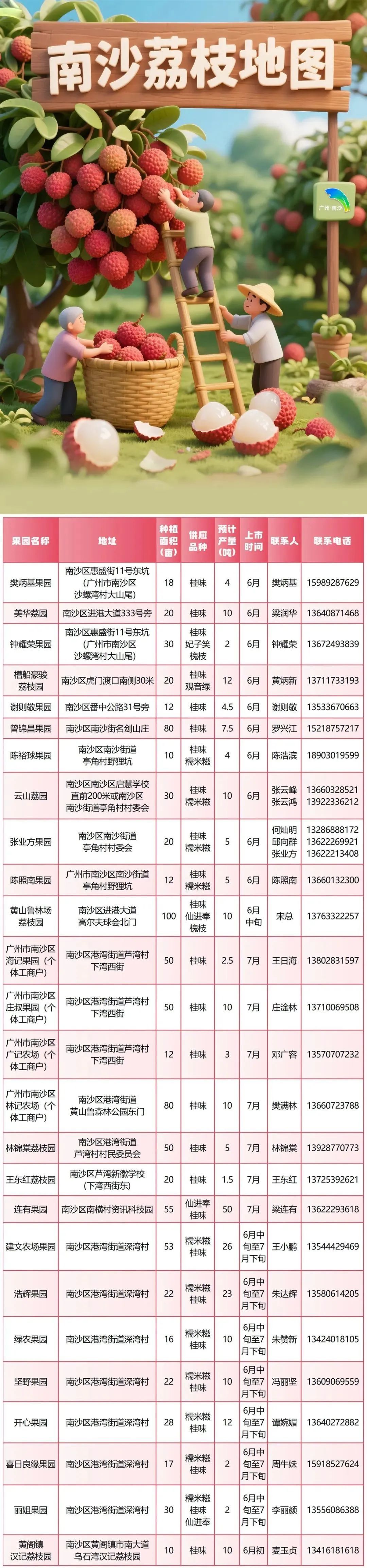 今年,南沙共有26个荔枝果园面向市民开放采摘,供应品种、详细地址、联系方式也已同步公开,街坊们可以根据口味爱好就近体验“边摘边吃”的乐趣!
