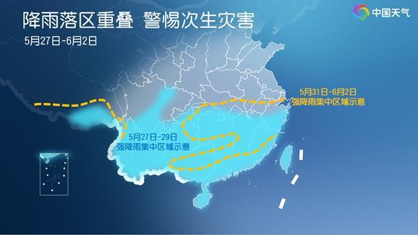 未来七天(5月27日至6月2日),南方两轮大范围降雨过程接踵而至,湖南、广东、广西等多地雨水或持续打卡,部分地区在两轮过程中会出现明显降雨,公众请关注预警信息,加强防叠加降雨可能引发的次生灾害。