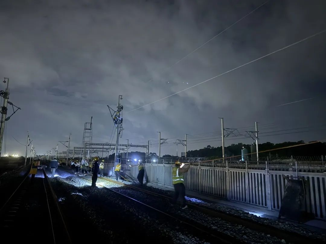 据介绍,承力索是接触网系统中的核心部件,主要作用是通过吊弦装置将接触线悬挂于空中,确保电力机车稳定受电,对列车的安全、高效运行具有重要意义。施工人员凭借精湛的技术和丰富的经验,密切配合,克服夜间作业视线不佳、操作难度大等挑战,严格遵循施工标准,历经2小时完成了首条长1196米承力索的架设任务。