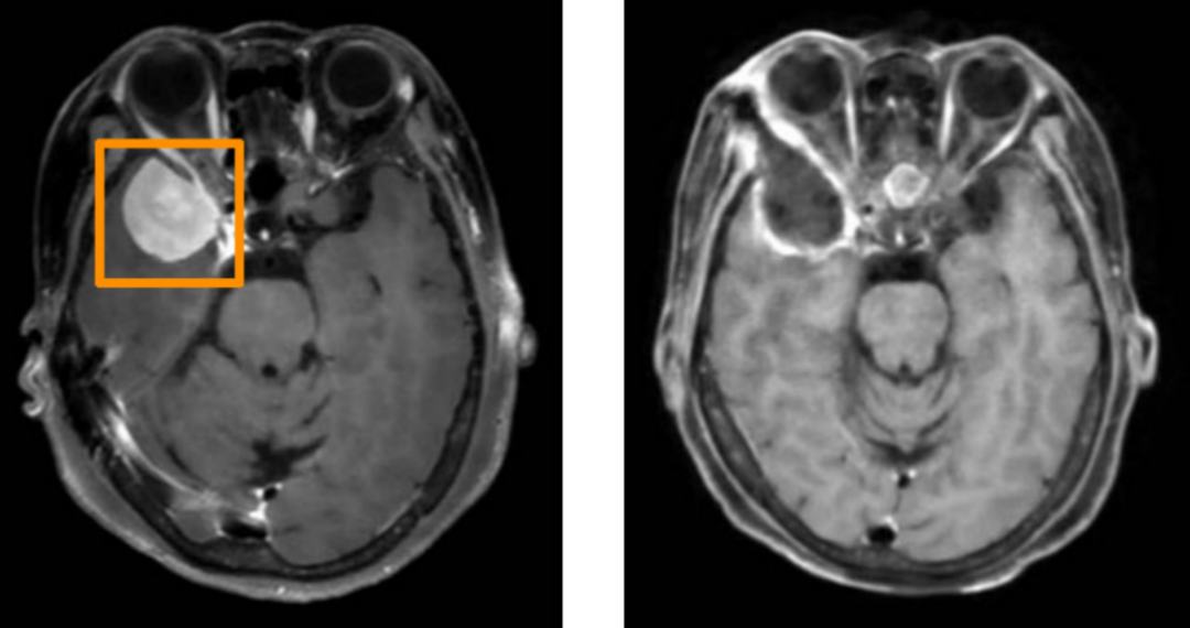 左图为术前MRI,术后MRI(右图)显示肿瘤已全切除