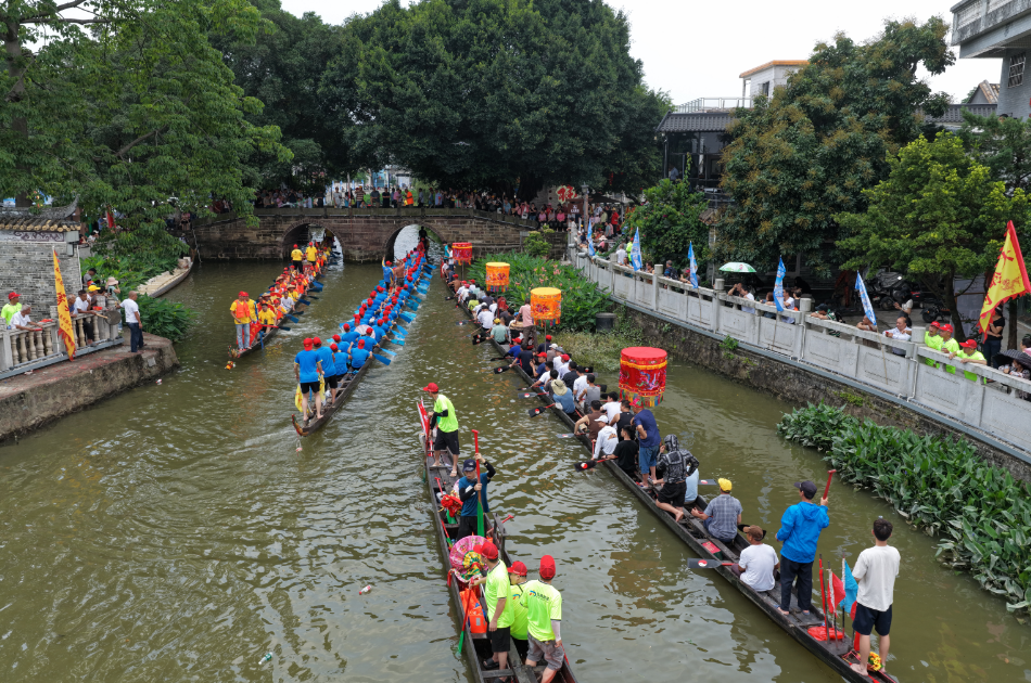 今天是农历五月初一,石楼镇大岭村龙津桥下热闹非凡,大岭、岳溪两村同时举办的龙船景盛会如约而至,来自石一、赤岗、茭塘还有化龙潭山村等兄弟村的龙船纷纷前来趁景,几十条龙舟汇聚于此竞风流,场面蔚为壮观。