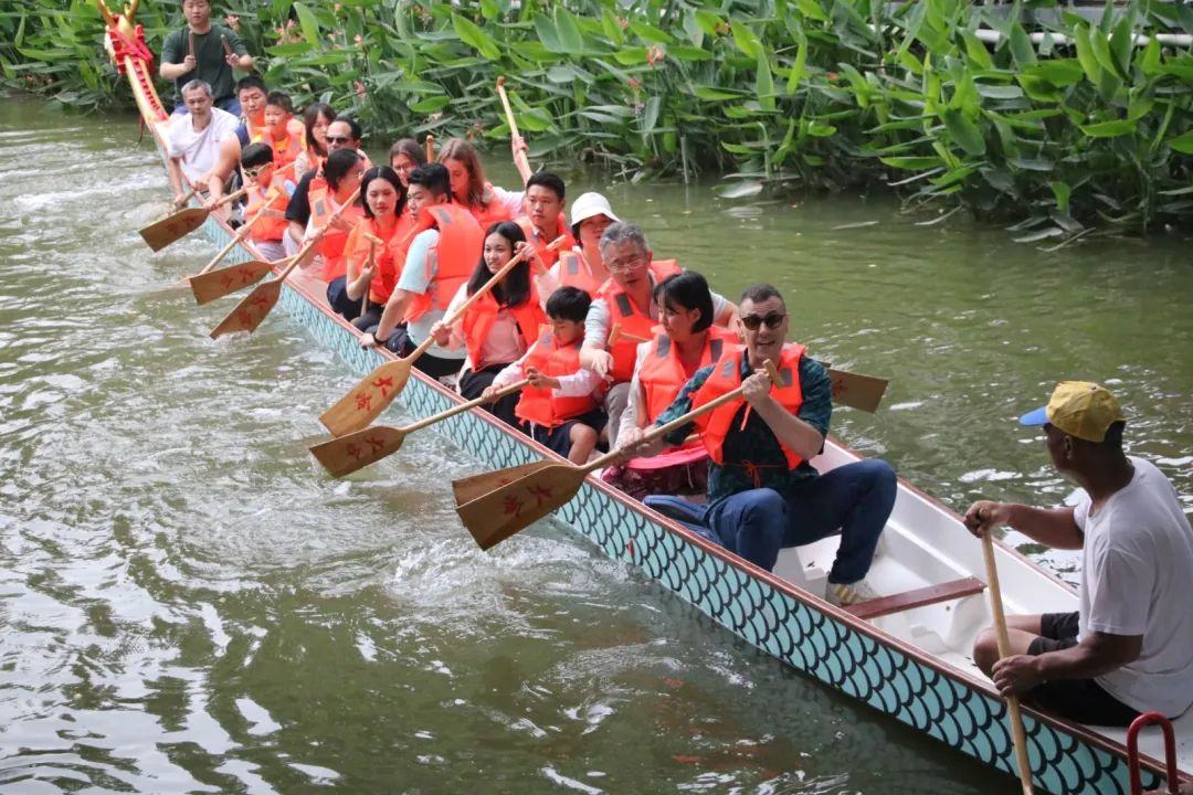 随后,百余名外国留学生登上龙舟,迫不及待地开启划龙舟体验之旅。尽管是初次尝试,大家热情满满、喊着口号协作划桨,伴着阵阵龙船鼓声,龙舟在玉带河上来回游弋,大家纷纷沉浸在新奇有趣的划龙舟体验中。