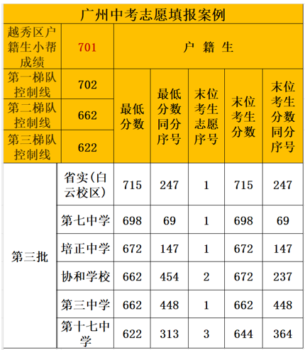 学生姓名:小帮,非广州市户籍生。升学区域:越秀区。模拟填报背景:第一梯度线为702分,下面数据参考了2024年的录取分数,数据仅用于分析政策。