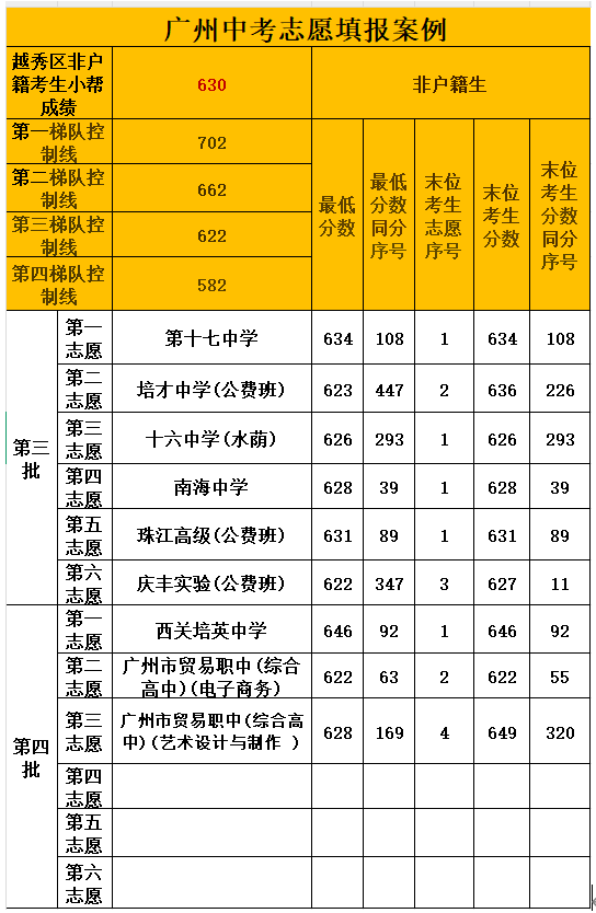 6、第六志愿十七中学的最低录取分数为622分,属于第三梯度。根据梯度优先录取原则,小帮可以被第十七中学成功录取。