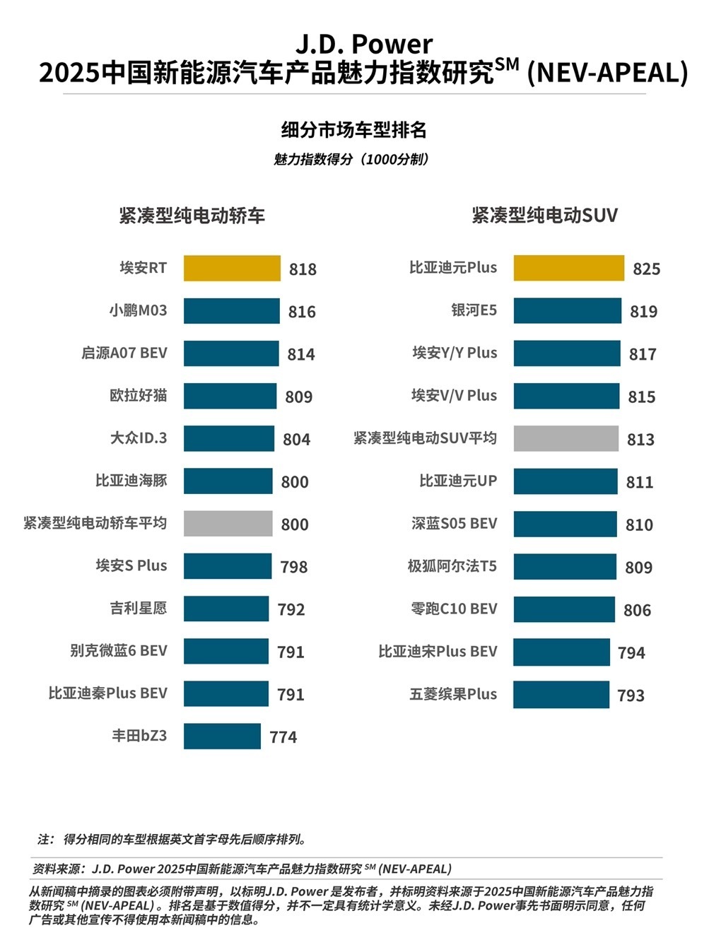 此次,J.D. Power还基于14个细分市场,评出了14款车型在2025中国新能源汽车产品魅力指数研究SM(NEV-APEAL)中评分最高的车型,如纯电轿车方面,小型、紧凑型、中型、大型各细分市场分别是比亚迪海鸥、埃安RT、特斯拉Model 3和小米SU7;SUV方面,评分最高的紧凑型、中型分别是比亚迪元Plus、智界R7 BEV。插电混动SUV方面,豪华、紧凑型、中型分别是问界M9 (增程式)、长安UNI-Z PHEV/深蓝S07 (增程式)以及坦克400 PHEV/理想L7 (增程式)。