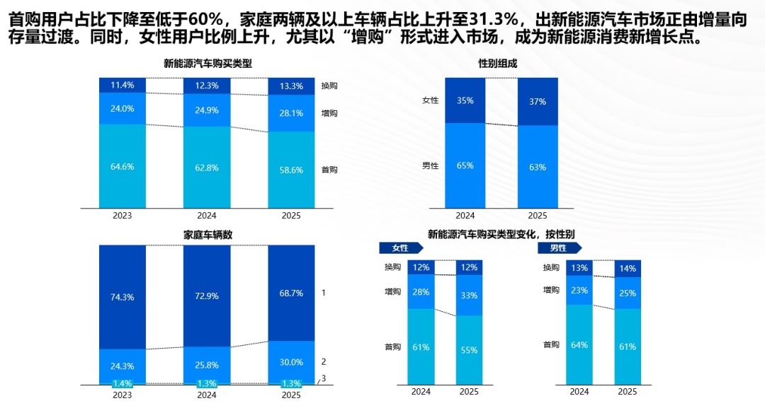在消费人群方面,以 “增购”形式进入市场的女性用户比例上升5个百分点,占所有女性用户达到33%,而男性增购用户比例仅上升2个百分点,达到所有男性用户25%,女性用户成为新能源汽车市场消费的全新增长点与关键驱动力。