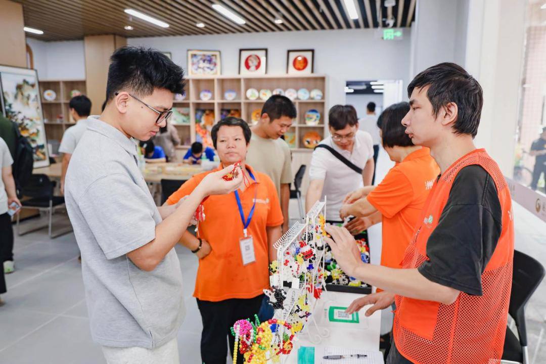 非遗工坊:非遗工坊主要以景泰蓝技艺为核心,开发景泰蓝圆盘、珐琅杯垫/冰箱贴、掐丝书签等系列文创产品,每一件作品均由残疾人学员与非遗代表性传承人共同创作,从掐丝到点蓝,从生疏到娴熟,见证技艺与自信的双重成长。开放日现场残疾人学员展示景泰蓝非遗手工艺品,作品兼具艺术价值与市场潜力,吸引嘉宾驻足选购;